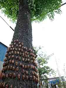 毎年8月1日のPLの花火大会の日から数日は写真のように、会社前のナンキンハゼにセミの抜け殻行進があるのですが、しかも毎年更新のパターンが異なります。ある時は1列に、ある時は縦列に、ある時は円周にそって、 昨年、今年は見当たりません。たぶんPL花火観客がこないので、行進のしがいがなく、なくなったのかも。 写真は4年前の今日