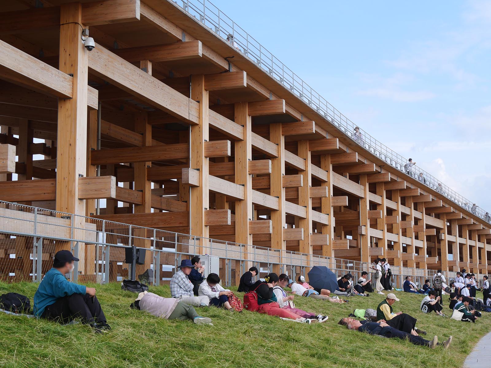 場所を知ると、この写真がただの風景でないことに驚かれるはずです。 昨日も半日、万博会場を歩きました。木造リングを半周して、改めてそのスケールと美しさに感動しました。昼でも夜でも圧倒される迫力。上にあるトイレは、国産杉の香りが漂い、とても清潔。各国パビリオンの個性的なデザインを上から眺められるのもまた格別です。 さて、この写真。地上の風景に見えますが、実はここ、地上12メートルにある木造リングの上なのです。このエリアではリングが2層構造になっており、さらに高い部分はなんと地上20メートル! 芝生も本物で、柔らかくて葉が長く、思わず寝転びたくなる心地よさ。実際、多くの人が横になって空を見上げていました。 万博会場に行かれたら、ぜひこの「空中の庭園」にも足を運んでみてください。