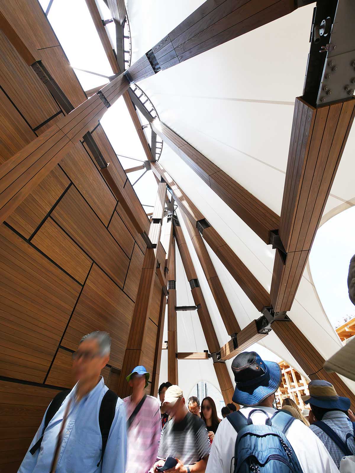 前回万博を訪問した際、ぜひ見たいと思っていたパビリオンのひとつがカタール館でした。隈研吾さんが手がけた建物ということもありますが、三角帆の木造帆船「ダウ船」のイメージが、木材の使い方にどう反映されているのかに興味があったからです。 順番待ちの列に並んですぐに帆の中に入ることができ、太陽の強い光を避けることができました。建物の外壁はスギ材で覆われており、木材業界でいう「羽目板」が使われています。他のパビリオンとは異なり、非常に緻密に、まるで日本的な几帳面さで貼りつけられていました。 単に板を突き合わせていく「突きつけ」ではなく、「本実加工」と呼ばれる施工方法が使われており、これはオス実(凸側)とメス実(凹側)に分かれた板を組み合わせて固定する方法です。しかも使われているスギ材は、節のない「無地材」。かなり厳選された材料であることがわかります。施工後に塗装されたように見えました。 スギの貼り方にも変化があり、塗装も単色ではなく微妙に異なる色合いが施されていて、全体としてのデザインがとてもすばらしいと感じました。建物の外壁としては相当の費用がかかったのではないかと思われます。 なお、鉄骨の継ぎ目などはあえて露出させていますが、この方がコストを抑えられるうえ、全体の見た目のバランスとしても、むしろ好印象を与える仕上がりになっていると感じました。