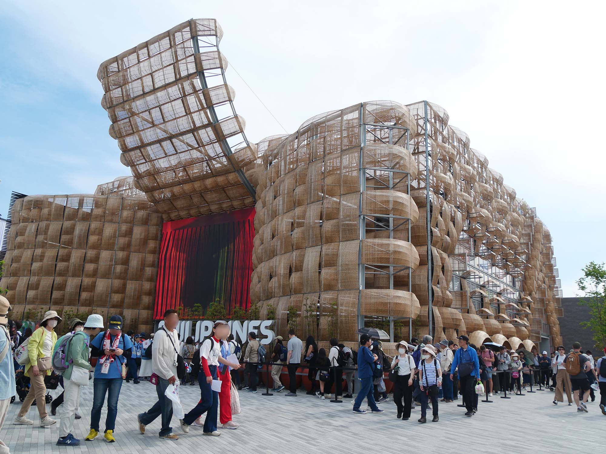 今日はフィリピン館のご紹介をします。 業界新聞や建築専門雑誌には何度も掲載されていますが、西尾レントオールさんが関係したもので他にインドネシア館・イタリア館も工事されました。一般流通木材からなるCLTパネルと鉄の組み合わせによる構法によって建てられています。 籐(とう)で外装をしている興味深い建物です。別名ラタンと呼ばれるヤシ科トウ属の蔓性木本の植物です。 軽くて強いのが特長で、そのため家具や籠に利用されています。熱気球のゴンドラ(バスケット)は今でも籐製が主流です。長いものは100メートルを超えるものもあるといいます。東南アジアではラタンの家具はどこでも見かけます。 パビリオン内部は「織物の森」ともいえる空間で、訪れる人々はさまざまな地域の織物や文化に包まれるような体験ができます。 自分の姿が自然のモチーフに変化し、大きなスクリーンに連動して動く姿は興味深いです。 また伝統舞踊やクラフト紹介のライブパフォーマンスがあります。 AIフォトブース、ギフトショップ、マッサージや軽食を楽しめるウェルネスエリアなども併設しています。