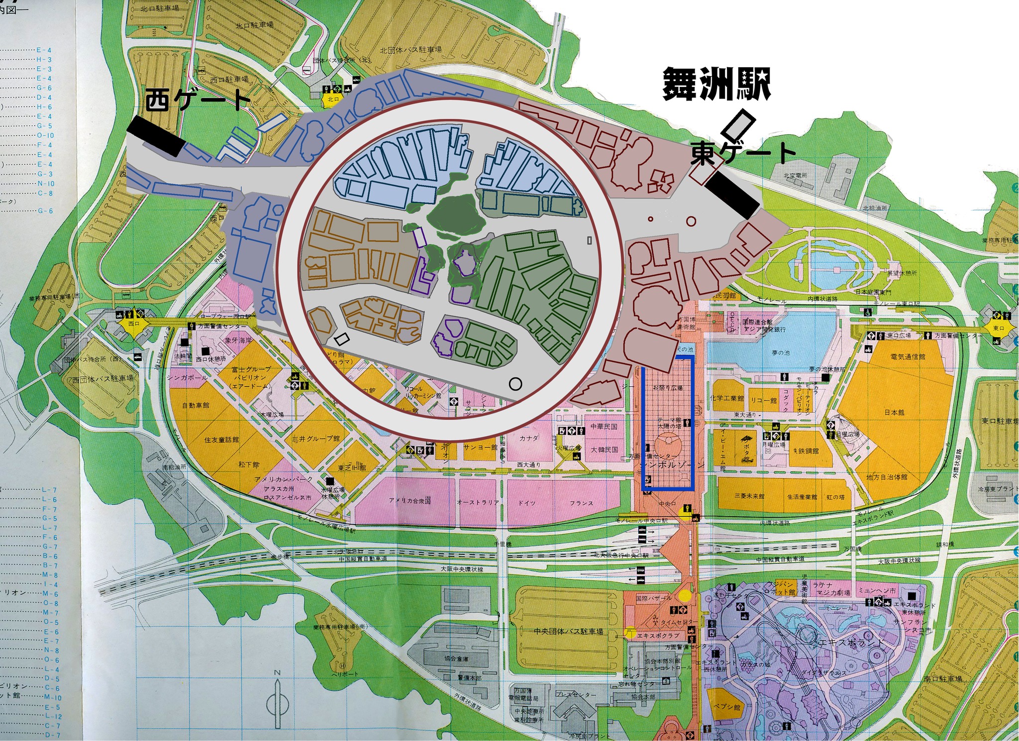 写真は1970年万博の無料配布会場マップです。南の野外劇場などはカットされていますが、会場はほぼ印刷されています。これに2025万博の簡易地図を合わせました。思ってたより2025年万博の会場が小さかったものですから、驚きました。千里万博は大きい会場だったことをあらためて思い知らされました。 だから83万人(最大入場者の日)も入場できたのですね。帰ることができなくて、お祭り広場で毛布と寝袋を提供して午前中まで忙しかったことを思い出します。 しかし泊まった人は大よろこび、翌日は会場1番乗りですから。 今回の万博でも電車に乗り切れなくて、バスもなくなり、会場で野宿とかあるかもしれませんね、そうなれば翌日はアメリカ館や住友館に確実に入れますね。 大屋根リングの内径615メートル お祭り広場の屋根291メートルで縮尺を合わせました。 また周道路の東西、会場の東西、南北などをグーグルマップなとで縮尺を確認しました。 追加;1970年の時はいくら歩いても足は痛くなりませんでしたが、今回は2万歩が限度です。