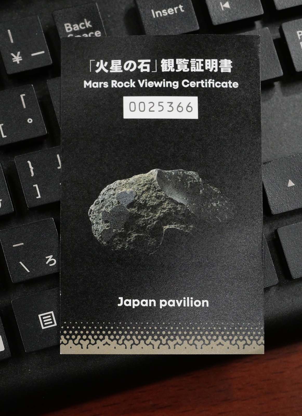 一昨日、日本館を訪れた際、順路の途中で「火星の石」が展示されており、間近で見ることができました。ゆっくり見られるというほどではありませんが、1970年万博の「月の石」のような大混雑とはまったく違い、スムーズに見学できました。 見終わったあと、アテンダーの方から写真のような記念品をいただきました。よく見ると、シリアルナンバー入りのカードで、「世界に一枚だけの日本館観覧記念カード」とのこと。なくなり次第配布終了とのことで、運よくもらえてラッキーでした。