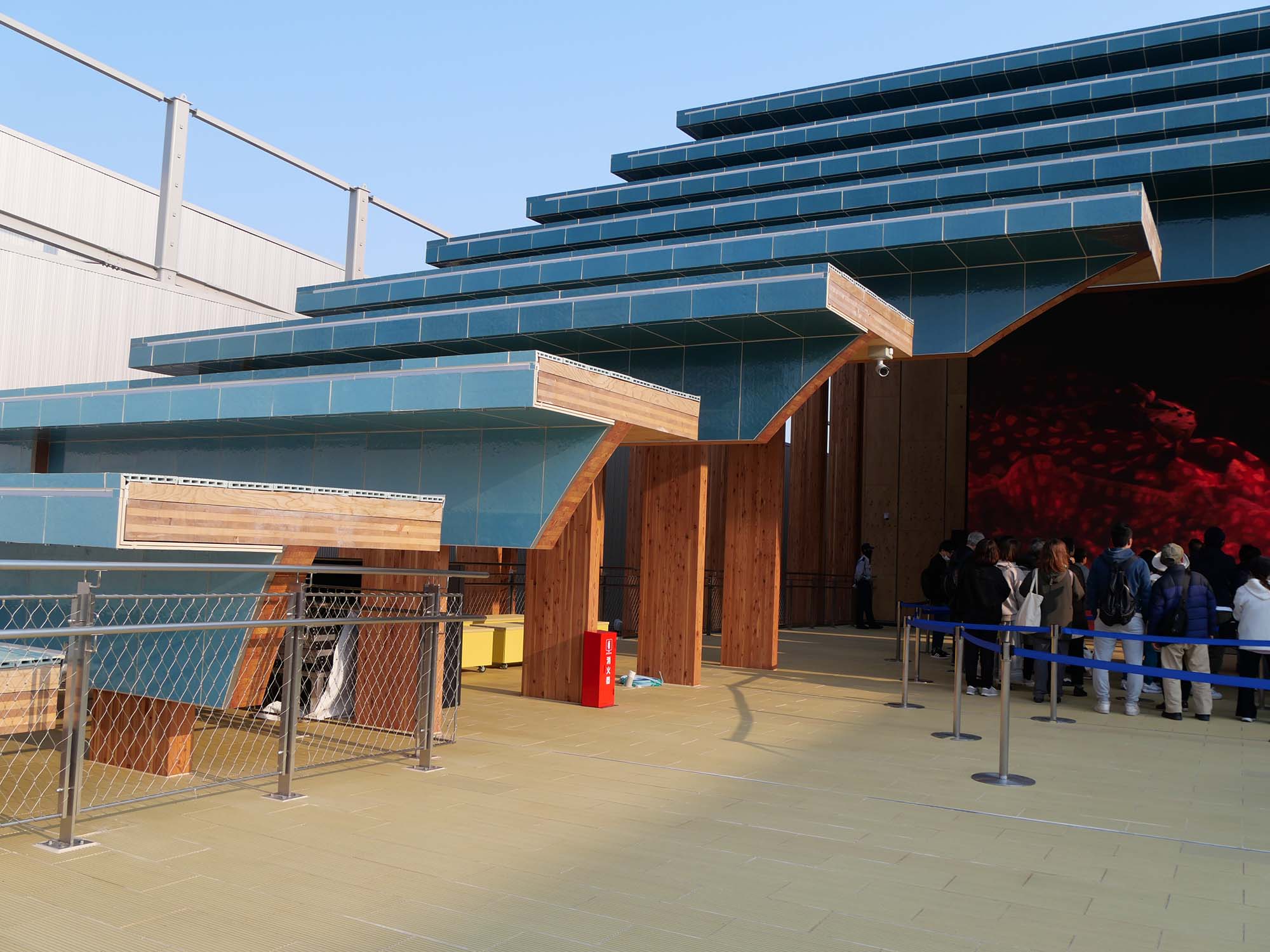 昨日、11回目の万博見学をしてきました。 今回、これまでと違っていた点の一つは、西ゲート前に新たにテントが1列設置されていたことです。ほんのわずかではありますが、日陰の下で待機できるスペースができ、ちょうど私たちもその恩恵にあずかることができました。 今回の目的の一つはルクセンブルク館の見学でした。入口で待っている際に気づいたのですが、驚いたことに、このパビリオンの外壁には日本製のコンパネ(12ミリ厚のベニヤ)が使われていました。木材業界で言うところの塗装合板で、型枠工事などに用いられるものです。取り外しが容易なように、金具とビニールテープで固定されており、会期終了後にはそのまま土木資材として再利用される予定とのことです。 館内最後の部屋での映像体験も非常に素晴らしく、足元まで見渡せる演出は迫力満点でした。