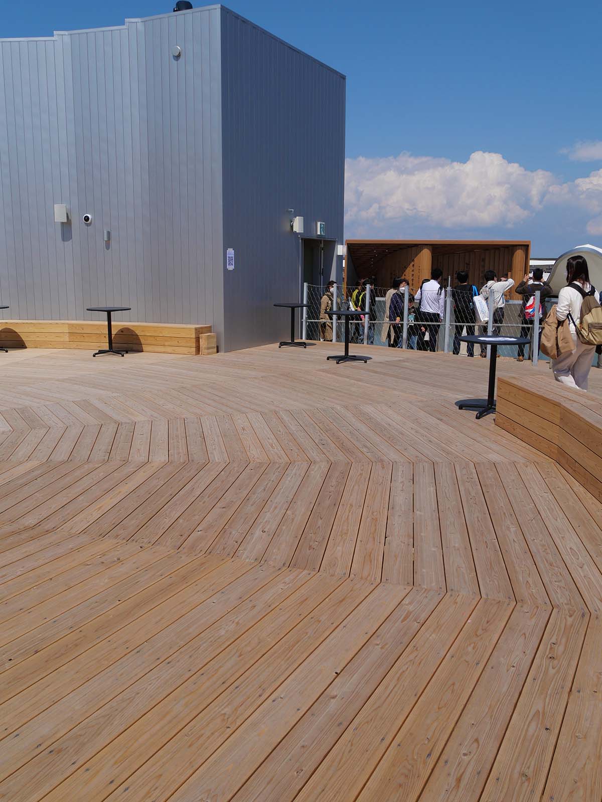 今週も万博に行く予定ですが、目的のひとつはチェコ館の再訪です。すでに一度見学しましたが、改めて足を運びます。 チェコ館の屋上にはウッドデッキが設置されていますが、その木の種類をまだ特定できていません。スタッフの方に尋ねたところ、同国産の木材を持ち込んだとのことでした。また、このデッキ材には滑り止め加工が施されており、日本ではあまり見かけないタイプです。館の前にも同じ仕様のウッドデッキが使われているようですが、詳しく解明したいと考えています。 写真は4月のテストラン時に撮影したものです。