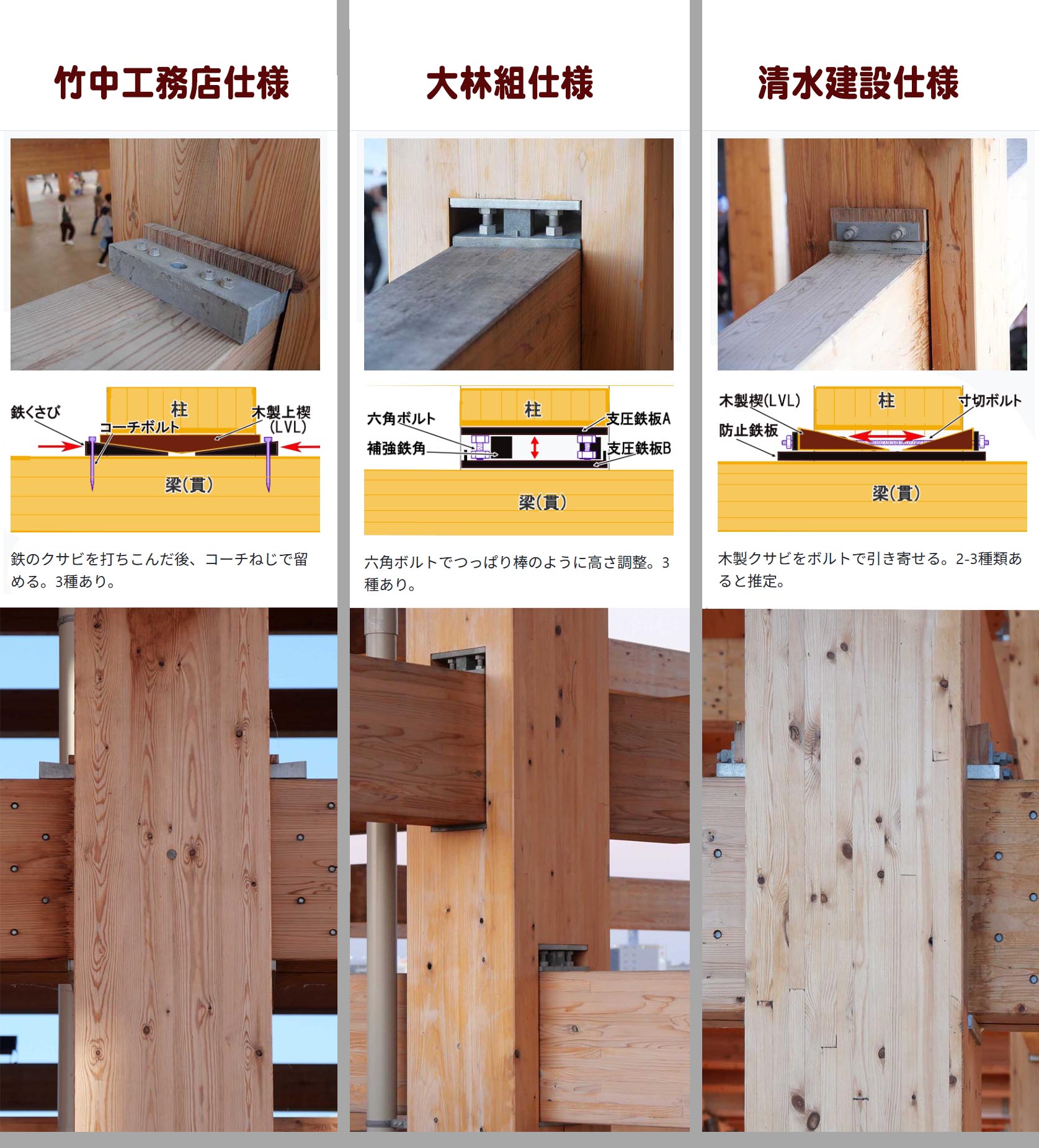 大屋根リングの「クサビ」について 大屋根木造リングは大変な人気を集め、今回の万博を象徴する存在でした。 今回は、その木造リングで、木材と木材が交差する部分を支えている「クサビ」についてご紹介します。 清水寺・舞台の床下構造では、柱を貫く桁を固定するために木のクサビが使われていました。つまり、交差部分に釘などの金物は使われていなかったのです。長い釘やボルトがなかった時代の、先人の知恵といえるでしょう。 この考え方を大屋根リングでも取り入れ、現代の建築基準に適合するよう進化させたものが、今回のクサビです。 建築系の専門誌だけでなく、一般誌でも工区ごとのクサビの違いが紹介されました。日経トレンディやBRUTUSなどでも取り上げられています。 リングは3つのゼネコン・グループによって施工されていますが、クサビを見ると、どのゼネコンが施工した工区かがすぐに分かります。そのため、万博通の方はクサビを指さしながら、少し誇らしげに説明してくれるのでした。 北東工区:大林組・大鉄工業・TSUCHIYA共同企業体 + 安井建築設計事務所 南東工区:清水建設・東急建設・村本建設・青木あすなろ建設共同企業体 西工区:竹中工務店・南海辰村建設・竹中土木共同企業体 + 昭和設計 一般には略して、「大林・清水・竹中の3つのゼネコン」と呼ばれています。 写真や図面による解説は多く見られますが、設計図ベースの説明が中心のため、専門外の方には、力のかかり方や固定の仕組みが分かりにくい面もあります。 多くの書籍では「ゼネコンごとに3種類」と記されていますが、実際に木造リングを観察すると、それとは少し形の異なるクサビも数多く見られます。 調べてみると、負荷のかかり方に応じて、基本形から耐力を高めた形へと変化させていることが分かりました。 大林組と竹中工務店では、それぞれ3種類を確認できました。清水建設については詳細な確認が取れていませんが、少なくとも2種類以上はあるようです。私が現地で確認できたものだけでも、合計8種類ありました。ひょっとすると、各ゼネコンごとに3種類ずつ存在するのかもしれません。 写真・イラストの説明 竹中仕様:鉄製のクサビを打ち込み、反対側も同様に固定する方式 大林仕様:縦ボルトを回転させ、上下に突っ張って固定する方式 清水仕様:2つの木製クサビをボルトで貫通させ、締め込んで固定する方式