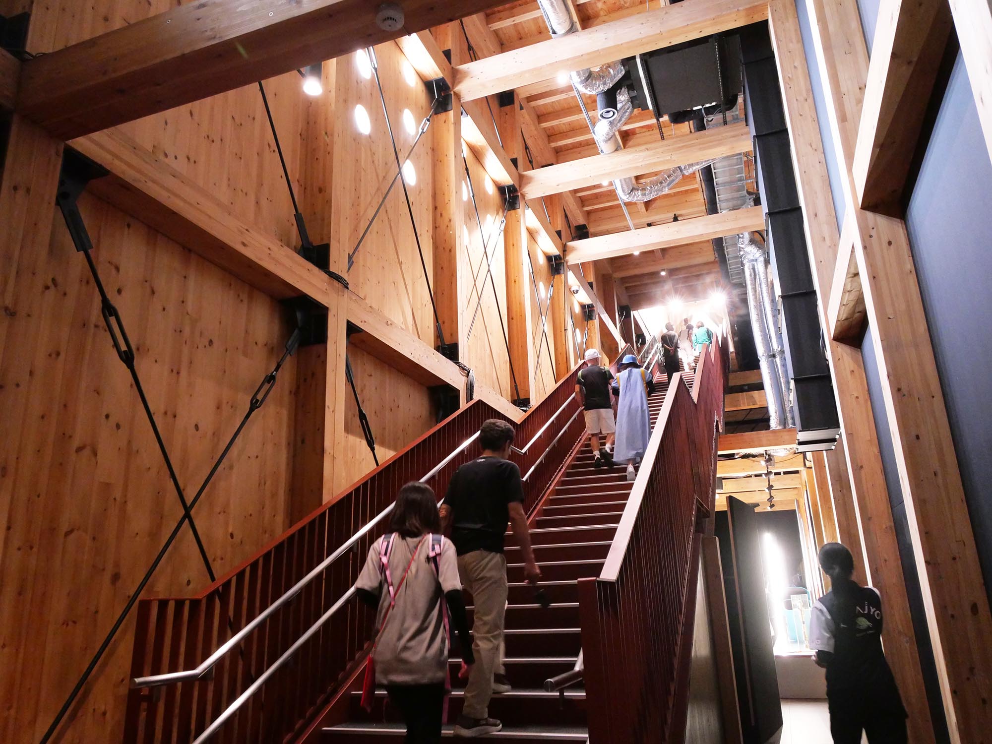 残る香りを3つのパビリオンで体験しました。 1.イタリア館 館内に入った瞬間、ふわっと木の香りが広がります。 西尾レントオールさんのCLTをそのまま露出させた構造で、化粧板やクロスを貼っていないため、木の呼吸がそのまま感じられる強めの香りです。ほっと心がゆるむような(今風に言えば“まったりする”)心地よさがあります。 2.アラブ首長国連邦館 入場してすぐ、どこか懐かしい匂いがしました。 昔の日本家屋の畳やゴザのような、落ち着く香りです。そこに乳香がほんの少し混じり、独特の風合いを作っています。ナツメヤシの葉軸200万本を巻きつけた柱から漂うものだそうです。天井が16メートルもある空間は神々しさがあり、香りと相まって心が静まる感覚でした。 3.アメリカ館 2回入館しましたが、並んでいる時からほのかに香りがします。特に雨上がりは、床材が湿ることで香りが強くなります。 ウッドデッキにはベイヒバ(yellow cedar)が使われていて、ヒノキとは少し違う独特の芳香です。人によって好き嫌いがある香りで、出来たばかりの頃はかなり強かったようです。カードマンの方も「最初は何の匂いか分からず少ししんどかった」と笑っていました。 4.その他(バーレーン館・北欧館など) 杉を使ったパビリオンでは、杉特有のやさしい香りが楽しめます。特に北欧館のレストランは印象に残っています。 写真はイタリア館の内部です。