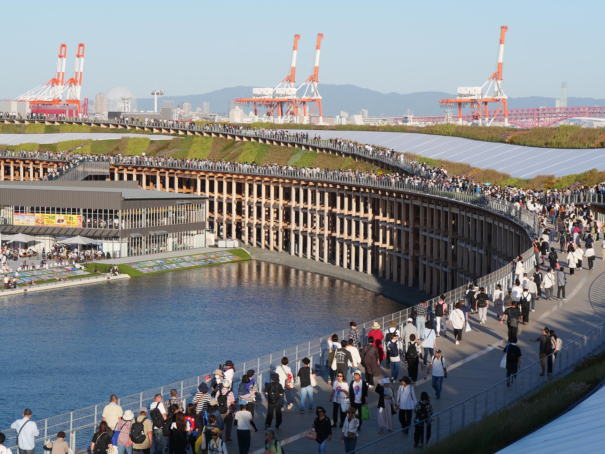 万博での木材の使い方について、ある機関紙の原稿を書いているところです。 写真を選んでいると、いろいろなことを思い出します。 当初は「木造リング」「木製リング」「大屋根木造リング」などと呼ばれていましたが、最終的には「大屋根リング」に落ち着きましたね。 私は、この大屋根リングが万博で最も強烈なインパクトを与えてくれた構築物だと思っています。 長さは 2,025 メートル。覚えやすい数字です。 デッキの長さだけでいえば、愛知万博の方が長かった(約2.6km)と思いますが、今回のように円形になっていたことで、大屋根リングの方が印象に残りました。 すべての海外パビリオンがリングの内側に収まっているのもわかりやすく、会場内を歩いて見るパビリオンと、木造リングから眺めるパビリオンでは景色(表情)がまったく違います。 ですから、わざわざリングに上がって歩く意味がありました。 実際に、各パビリオンの設計者は、木造リングからの目線を意識して設計していましたね。 このリングのおかげで、万博が成功したと言っても言い過ぎではないと思います。 歩いて見た人は皆、感動しました。 そして数日前から、いよいよ解体が始まっています。 写真は10月に撮影したもので、背景には夢洲のコンテナヤードのクレーン、天保山大橋、そして生駒山系が映っています。