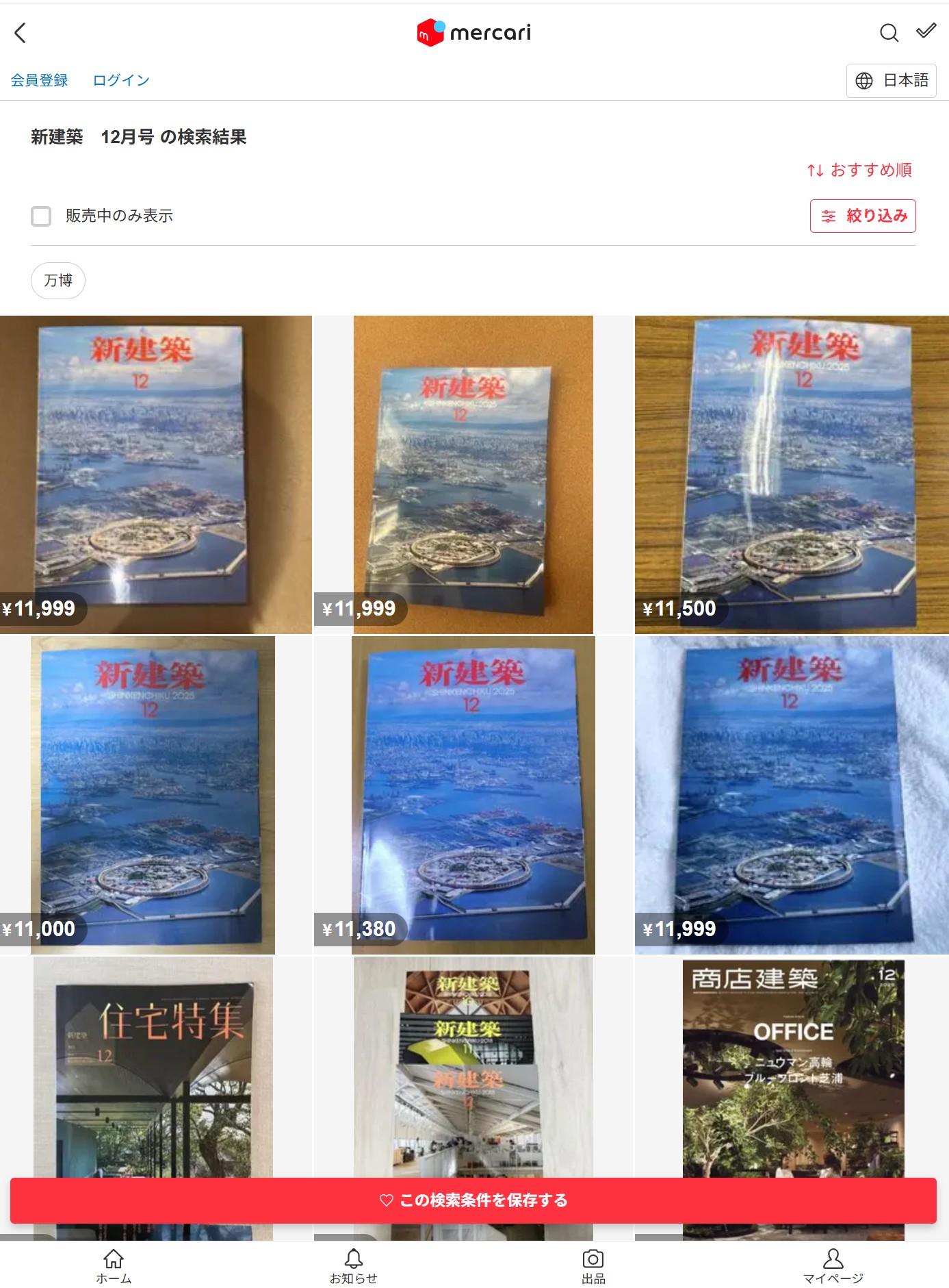 月刊雑誌 新建築12月号に万博特集がありましたので、昨日大阪に買いに行きました、難波の紀伊国屋、丸善、そしてジュンク堂(大型本屋だったのが雑貨店に変わってます)、そして梅田の紀伊国屋書店、つまり大阪の大型書店4店まわりましたが、売り切れでした。本屋によると万博特集なのでスグに売り切れたとのこと。残念。本屋が少なくなっていること、万博のレガシー、パビリオンなどの著作権や許可の問題、取材の正確性など、つい最近も体験したので、思うところがあります。 それであわててメルカリで探しましたら、これです。 2,860円が11000円以上で売られています。雑誌が数日で4倍になりました。追加情報 今4万円以上になってます。