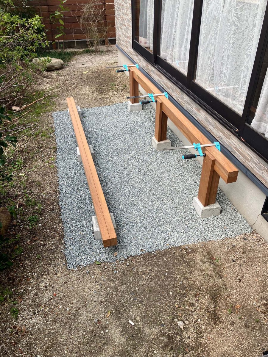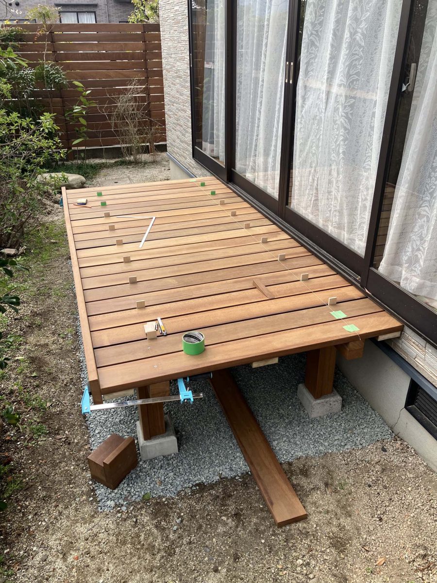 束石のレベルを事前調整済でしたが、大引を置くとガタつき(大引に反り)束石の再調整に1時間要しました。