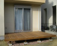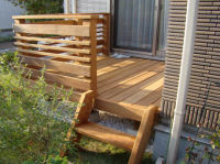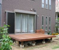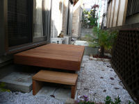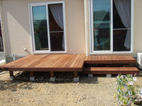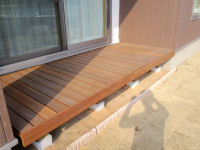 ウッドデッキのキットを探していたら中川木材産業様のホームページにたどり着きました。中庭のスペースに合わせて検討した結果、キットウッドデッキHardのSS--32タイプを購入することに決めました。組み立ては11月19、20日の土日の2日間で行いました。土台のヒノキ材は床面(コンクリート)の傾斜に合わせて切り取り水平を出しました。元々、濡縁があった位置に設置するため外壁に打ち付けてあった桟を利用出来るようにウリン材の床板の裏桟を一度取り外し内側へ15ミリ程度移動し既設の桟に掛けられるようにしました。(写真参照) 人の出入りの多い左端の・・・