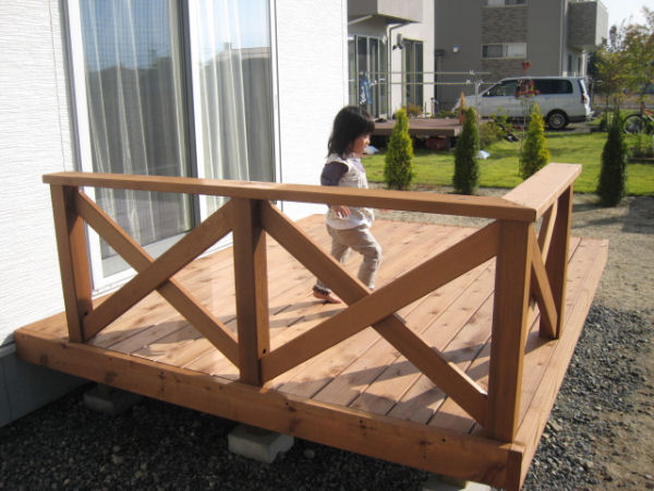 「ウッドデッキが欲しい」と思い始めた当初は自力で作ることも考えましたが、必要な工具を揃えるだけでもけっこう費用がかかってしまうことや、たとえ 工具を揃えたところで、自分のような素人が一人で果たして作れるのか?という不安もあり二の足を踏んでおりました。その点、貴社のキットデッキはカット と塗装の必要がなく、また組み立ても容易とあって、まさに自分にうってつけの商品だったと思います。 束石の設置はやはり骨の折れる作業でしたが、キットを注文する前に行いましたので、時間的な余裕もあり、あまり神経質にならずのんびりやりました。 一方、デッキの製作に関しては、3歳の娘の面倒を見ながらの作業であったため、何度も作業を中断しなければならず、とにかく捗らない状況でしたが、それでもどうにかこうにか2日間で完成させる事が出来ました(実働8時間程度)。 思いのほか時間はかかりましたが、作業自体はとても簡単で、説明書もわかりやすくて良かったと思います。また、初めてのDIYということで、細かなミ スは幾つかあったものの、出来上がったデッキは評判通りの見栄えの良さで大満足です。何より全体を通してデッキ作りを楽しんでやることが出来ました。このたびは優れた商品をご提供いただき本当にありがとうございました。